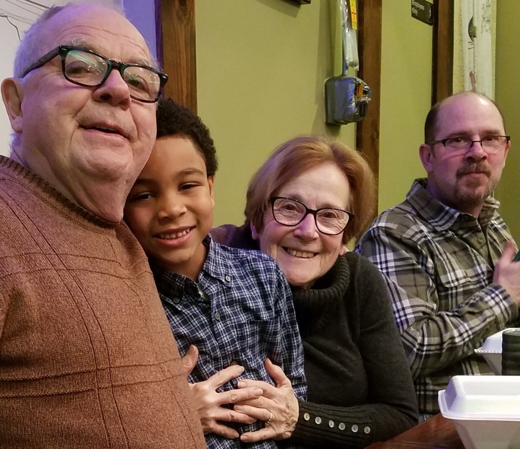 Thomas with grandma and grandpa (hibachi birthday 2015)